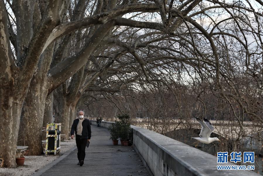 1月19日,在意大利首都羅馬,一名男子戴著口罩走在臺伯河邊。