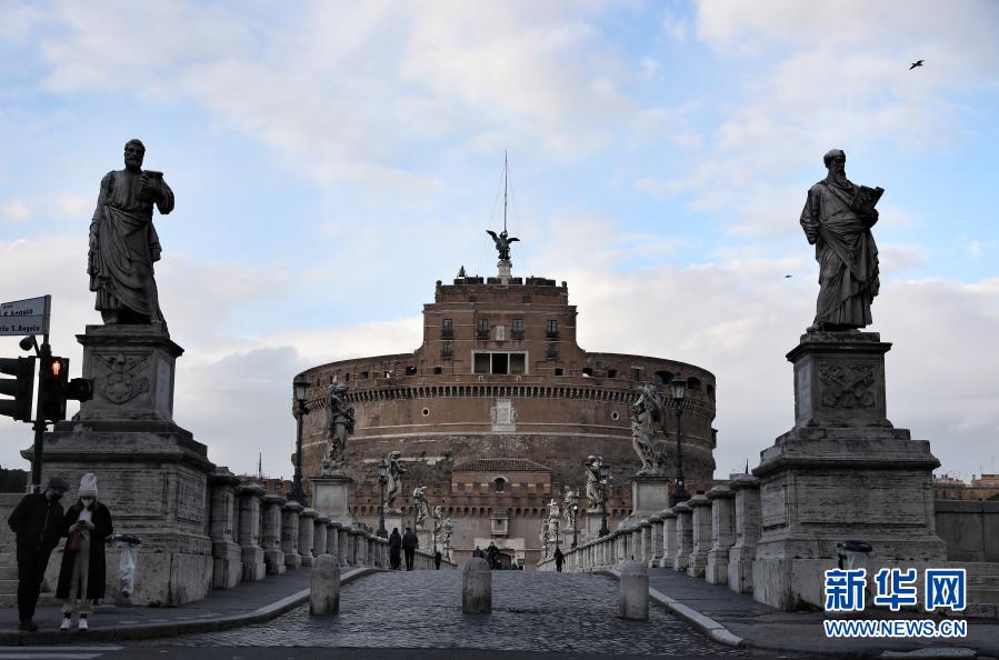 1月19日,在意大利首都羅馬,人們戴著口罩走過關閉的圣天使堡。 根據意大利衛生部19日公布的新冠疫情數據,該國累計新冠確診病例2400598例。 新華社記者程婷婷攝