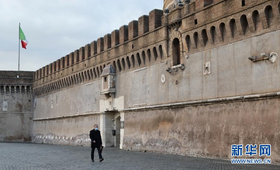 1月19日,在意大利首都羅馬,一名男子戴著口罩走過關閉的圣天使堡。 根據意大利衛生部19日公布的新冠疫情數據,該國累計新冠確診病例2400598例。 新華社記者程婷婷攝