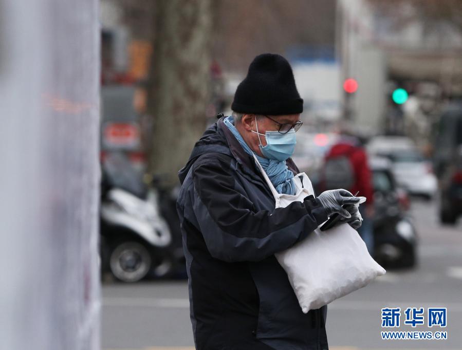 1月20日,在法國巴黎街頭,一名等紅燈的老人戴著口罩和塑料手套。新華社記者 高靜 攝
