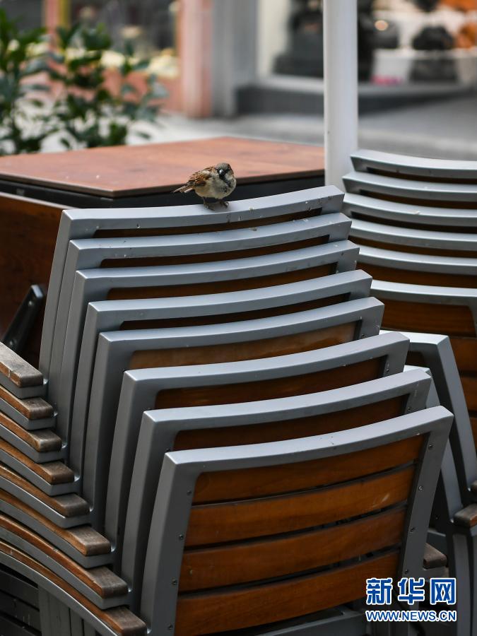1月20日,在德國法蘭克福一家因疫情防控措施臨時關閉的餐廳門口,一只麻雀在堆放著的餐椅上停留。新華社記者 逯陽 攝