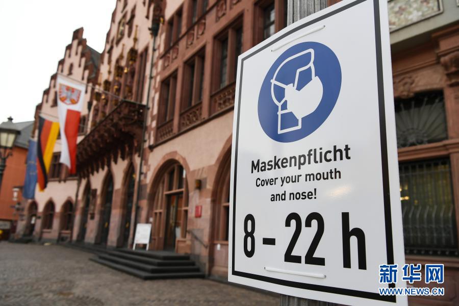 這是1月20日在德國法蘭克福羅馬廣場拍攝的一處提醒人們佩戴口罩的警示牌。新華社記者 逯陽 攝