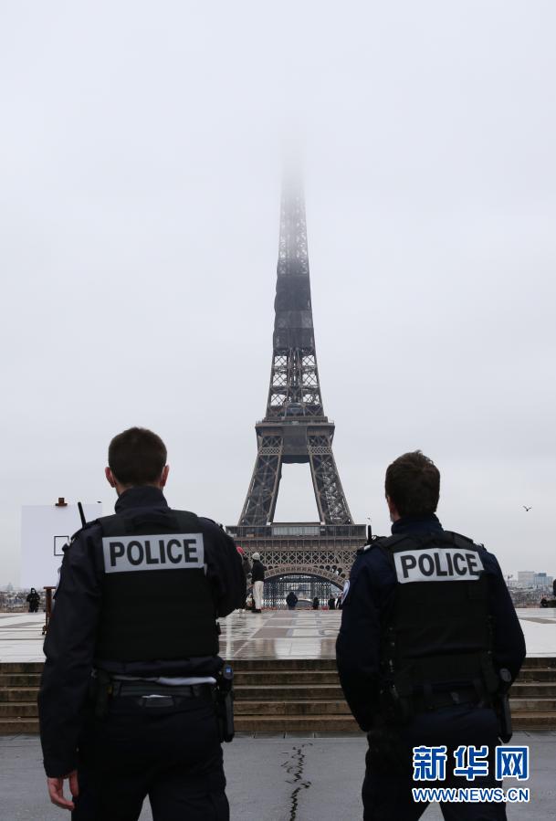 1月27日,警察在法國巴黎埃菲爾鐵塔附近的特羅卡德羅廣場巡邏。