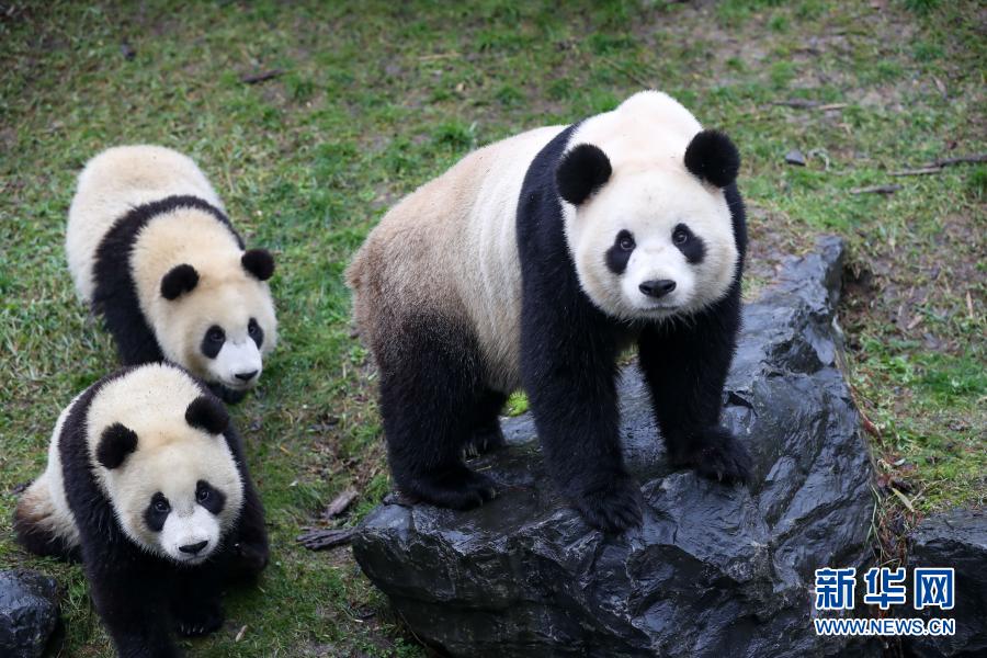 1月27日,大熊貓“好好”和它的雙胞胎幼崽“寶弟”和“寶妹”在比利時布呂熱萊特天堂動物園玩耍。