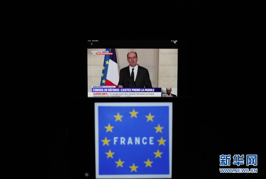 這是1月30日在法國巴黎拍攝的法國總理卡斯泰的新聞發布會視頻畫面以及法國邊界標志牌的照片。