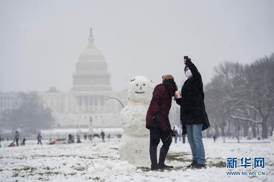 1月31日,人們在美國華盛頓國會附近與雪人合影。 當日,美國首都華盛頓迎來大雪。 新華社記者 劉杰 攝