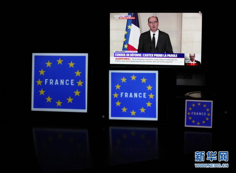 這是1月30日在法國巴黎拍攝的法國總理卡斯泰的新聞發布會視頻畫面以及法國邊界標志牌的照片。 法國總理卡斯泰29日晚宣布,為遏制新冠疫情,法國政府決定對歐盟以外國家關閉邊界。 新華社記者 高靜 攝