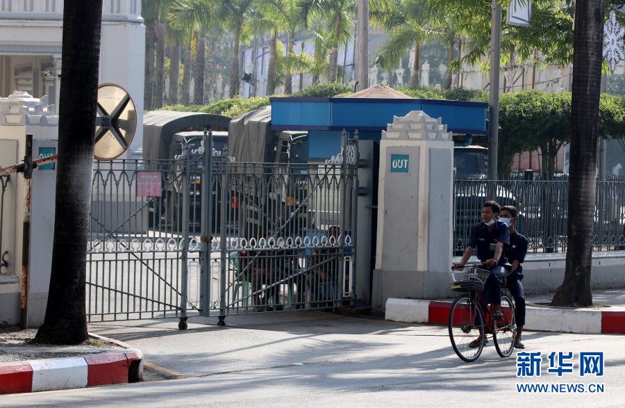 這是2月1日拍攝的被封閉的緬甸仰光市政大樓,院內停著數輛軍車。 緬甸總統溫敏、國務資政昂山素季及一些民盟高級官員1日凌晨被軍方扣押。緬甸軍方隨后宣布,開始實施為期一年的緊急狀態,國家權力被移交給國防軍總司令。 新華社記者 張東強 攝