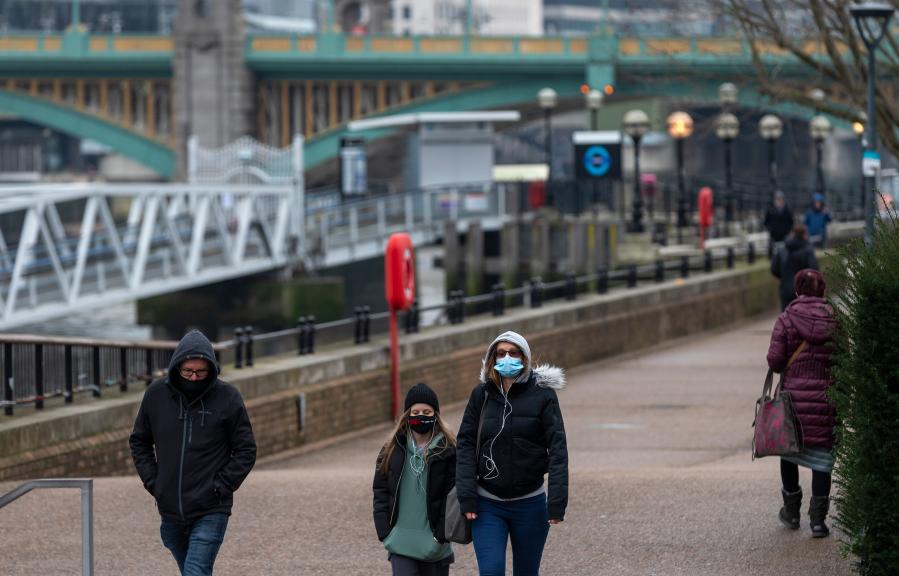 2月1日,人們戴著口罩走在英國倫敦泰晤士河畔。