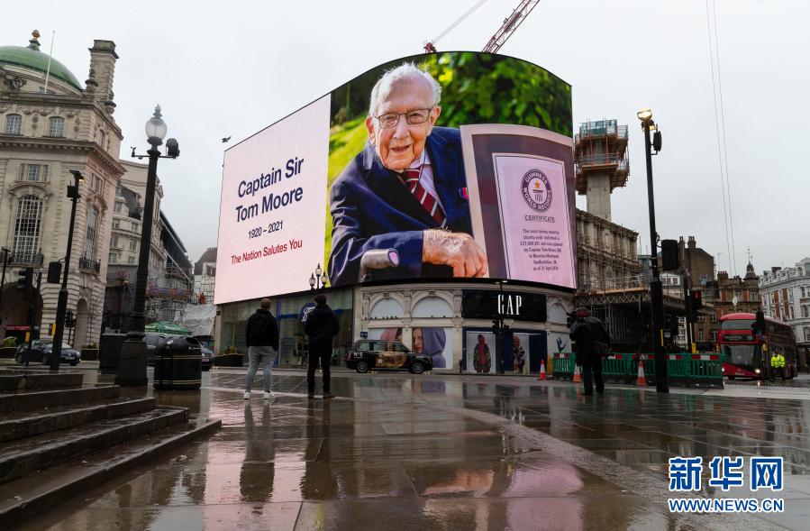 2月3日正午12時,英國倫敦的皮卡迪利廣場大屏幕上顯示向湯姆·穆爾致敬的內容。