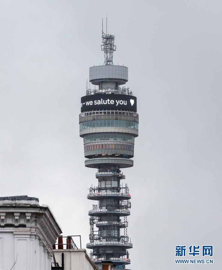 2月3日,英國倫敦的英國電信公司塔頂顯示向湯姆·穆爾致敬的內容。 為抗擊新冠疫情募得數千萬英鎊善款的英國百歲老兵湯姆·穆爾2日因感染新冠病毒去世,距離他入院治療僅兩天。 新華社記者 韓巖 攝 |