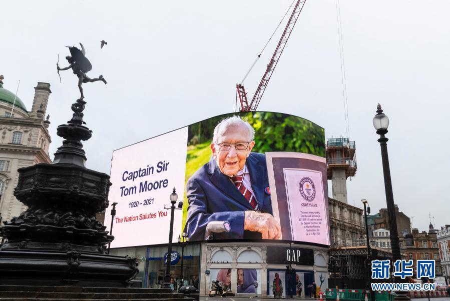 2月3日正午12時,英國倫敦的皮卡迪利廣場大屏幕上顯示向湯姆·穆爾致敬的內容。 為抗擊新冠疫情募得數千萬英鎊善款的英國百歲老兵湯姆·穆爾2日因感染新冠病毒去世,距離他入院治療僅兩天。 新華社記者 韓巖 攝