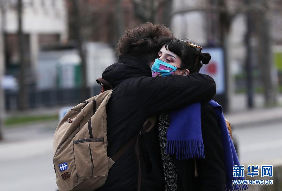 2月3日,一對情侶在法國巴黎街頭擁抱。新華社記者 高靜 攝
