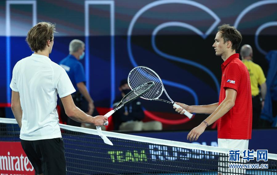 澳大利亞網球公開賽即將于2月8日拉開戰幕,為了確保賽事安全、順利地舉行,澳網組委會制定了諸多防疫措施和規則,并率先在熱身賽——ATP杯網球賽中執行:原本可供自由通行的各個場館被分成了多個區域,觀眾購票后只能在相應區域內活動以減少人員流動;所有進入墨爾本公園球場的人員均須佩戴口罩;持證人員需下載澳網健康客戶端,并每日填報健康信息以獲得入園許可;園區內觀眾坐席、就餐區域等增加清潔次數并實行社交距離保持政策等。 2月6日,在ATP杯網球賽中,俄羅斯選手梅德韋杰夫和德國選手茲維列夫(左)賽后以碰拍代替握手。 新華社記者 白雪飛 攝 |