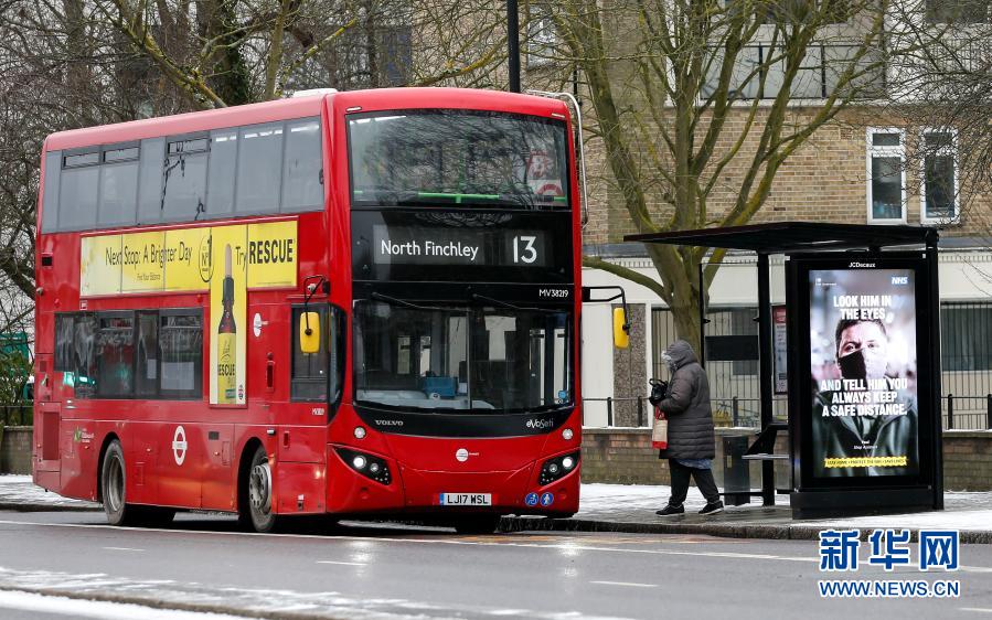 2月8日,一名乘客在英國倫敦準備乘坐一輛公交車,車站的廣告牌提示人們保持社交距離。