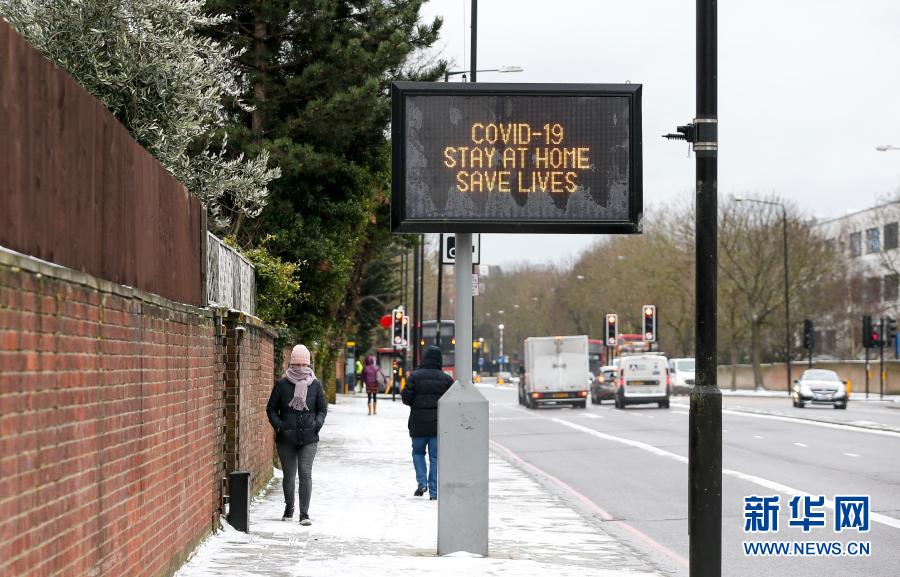 2月8日,行人從英國倫敦一處電子屏幕旁走過,屏幕上顯示英國疫情防控口號——“留在家中,挽救生命”。