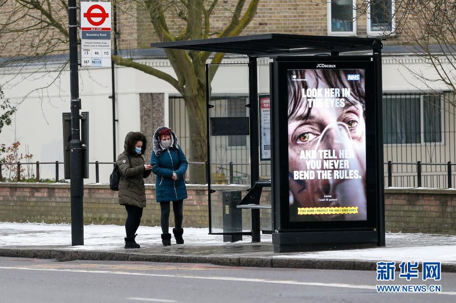 2月8日,乘客在英國倫敦一處公交車站等車,車站的廣告牌提示人們遵守防疫規定。