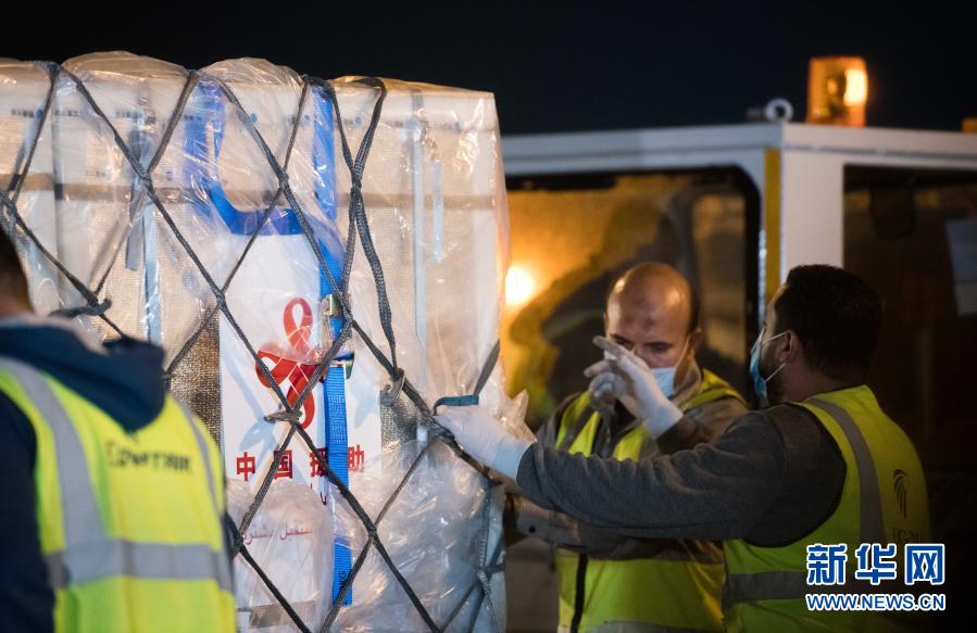 中國援助埃及的首批新冠疫苗23日凌晨運抵開羅,援助阿盟秘書處的新冠疫苗也同機抵達。新華社記者 鄔惠我 攝