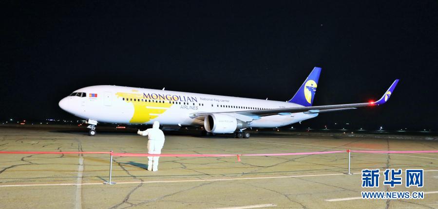 這是2月23日凌晨在蒙古國首都烏蘭巴托成吉思汗國際機場拍攝的載有中國援助的新冠疫苗的飛機。新華社記者 阿斯鋼 攝