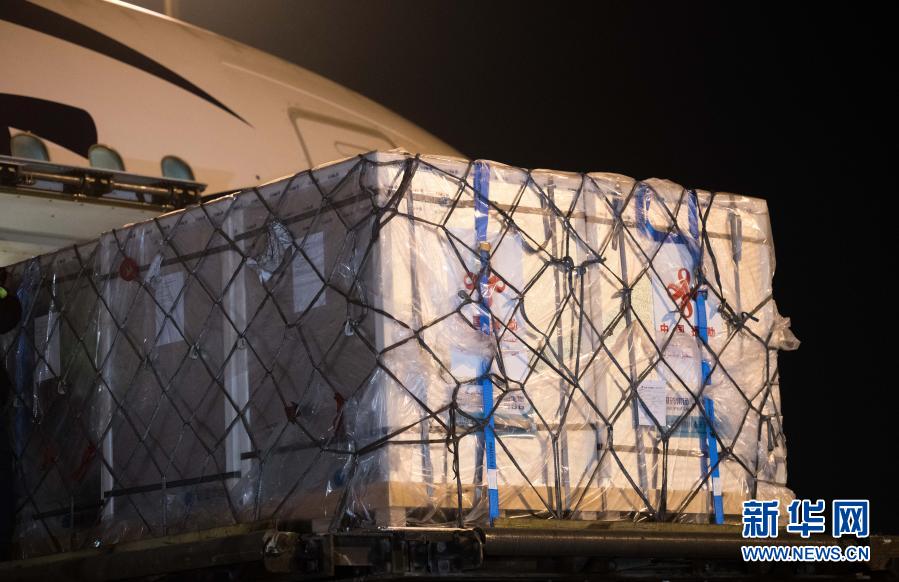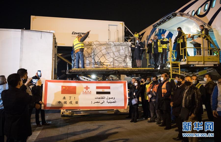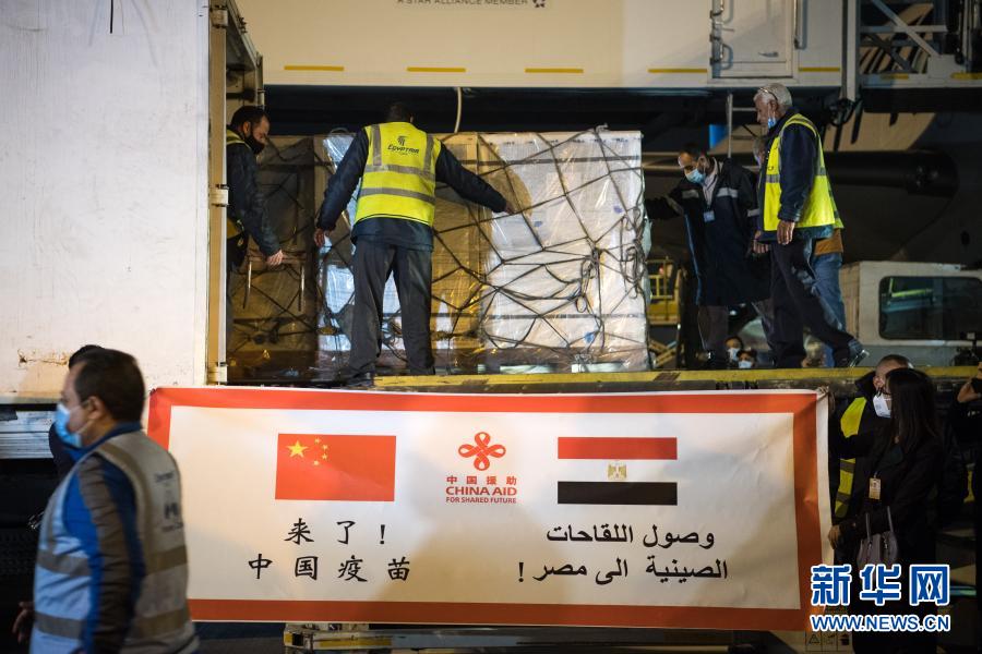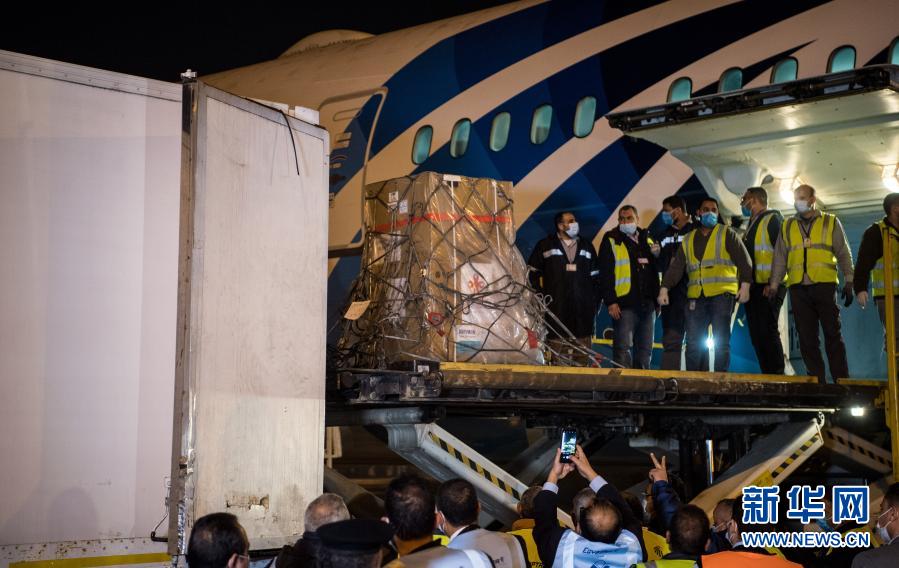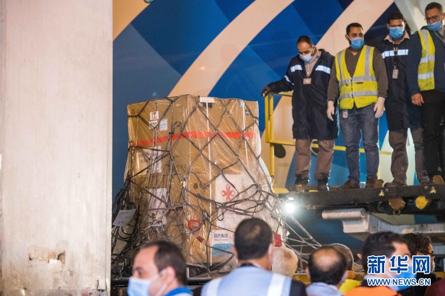 這是2月23日在埃及開羅國際機場拍攝的疫苗。 中國援助埃及的首批新冠疫苗23日凌晨運抵開羅,援助阿盟秘書處的新冠疫苗也同機抵達。新華社記者 鄔惠我 攝