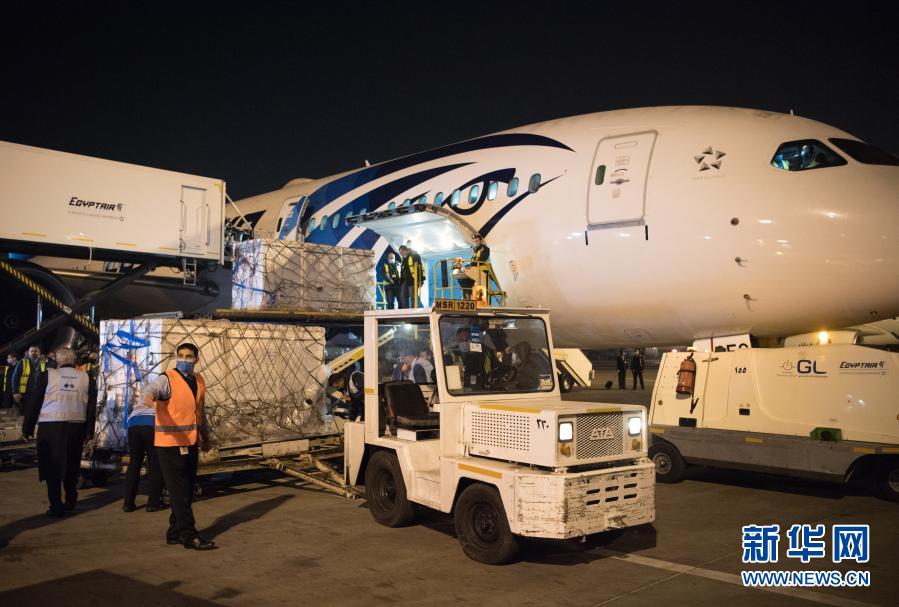 2月23日,在埃及開羅國際機場,工作人員運輸疫苗。 中國援助埃及的首批新冠疫苗23日凌晨運抵開羅,援助阿盟秘書處的新冠疫苗也同機抵達。新華社記者 鄔惠我 攝