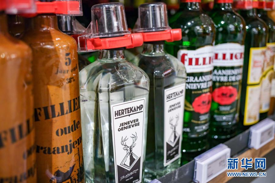 這是3月2日在比利時布魯塞爾的商店內拍攝的不同品牌的仁內華酒。比利時、德國、法國、荷蘭地區生產的任內華酒是中歐地理標志協定中首批受保護的歐盟地理標志產品。