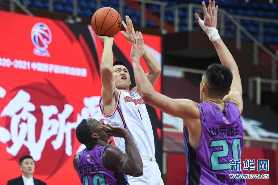 3月10日,廣東東莞大益隊球員周鵬(上)在山東西王隊球員哈德森(左)、陶漢林的防守下投籃。 當日,在浙江諸暨舉行的2020-2021賽季中國男子籃球職業聯賽(CBA)第三階段第44輪比賽中,廣東東莞大益隊以104比90戰勝山東西王隊。 新華社記者 江漢 攝 |