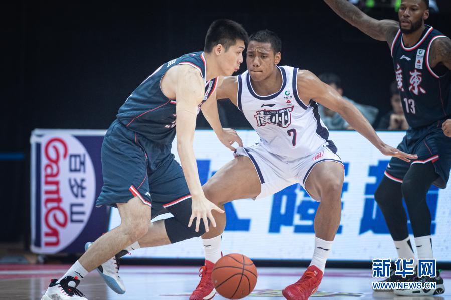3月14日,廣東東莞大益隊球員任駿飛(左)在比賽中突破時代中國廣州隊球員祝銘震的防守。 當日,在浙江諸暨舉行的2020-2021賽季中國男子籃球職業聯賽(CBA)第三階段第46輪比賽中,廣東東莞大益隊以110比104戰勝時代中國廣州隊。 新華社記者 江漢 攝