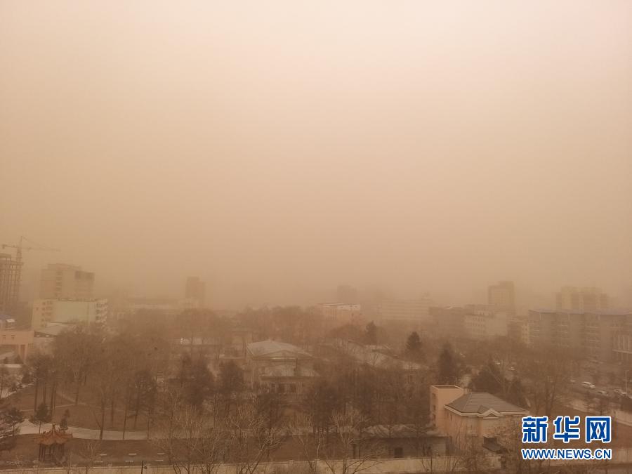 這是3月14日拍攝的沙塵暴中的蒙古國烏蘭巴托。