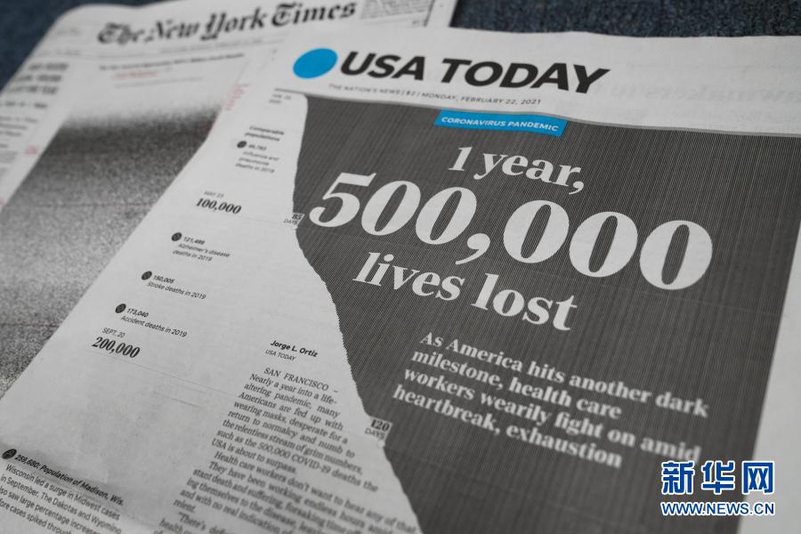 2021年2月22日出版的《今日美國》報頭版整版報道美國累計新冠死亡病例超過50萬例。新華社記者 王迎 攝