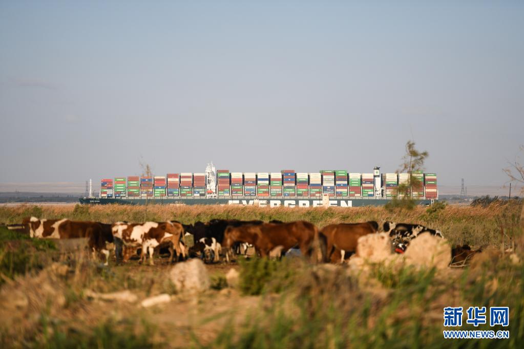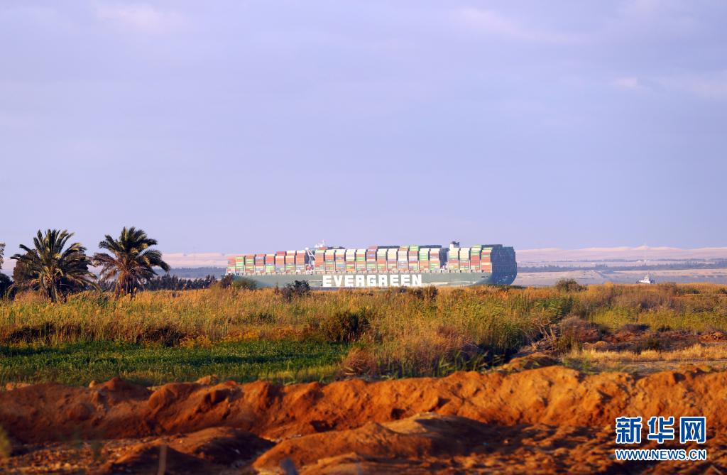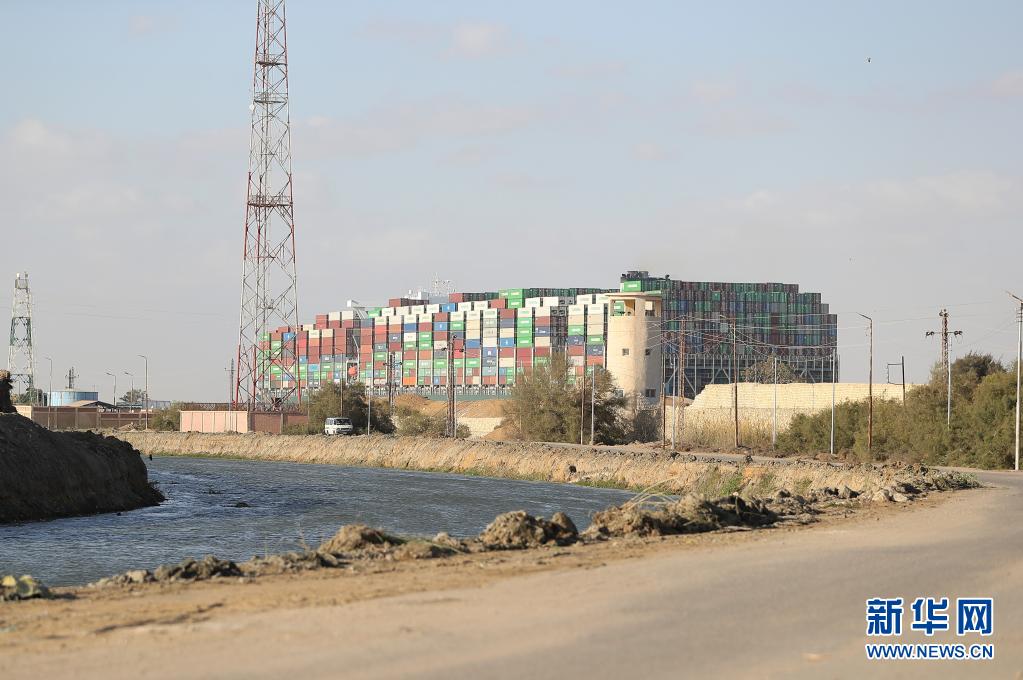 這是3月29日拍攝的移動至埃及蘇伊士運河正常航道上的重型貨輪。 埃及蘇伊士運河管理局29日發布聲明說,擱淺在蘇伊士運河中的重型貨輪已經完全移動至正常航道并駛離擱淺位置。 新華社記者 隋先凱 攝