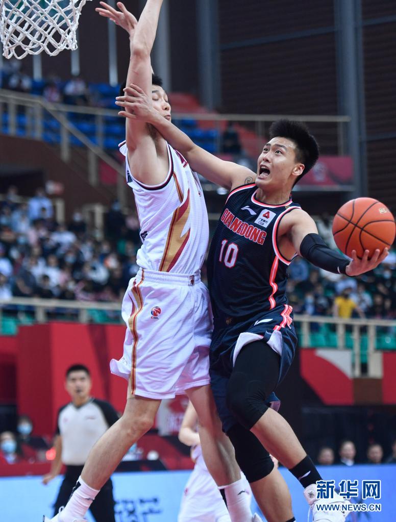 3月29日,廣東東莞大益隊球員趙睿(右)在比賽中上籃。 當日,在浙江諸暨進行的2020-2021賽季中國男子籃球職業聯賽(CBA)第四階段第50輪比賽中,廣東東莞大益隊以125比119戰勝浙江稠州金租隊。 新華社記者 黃宗治 攝