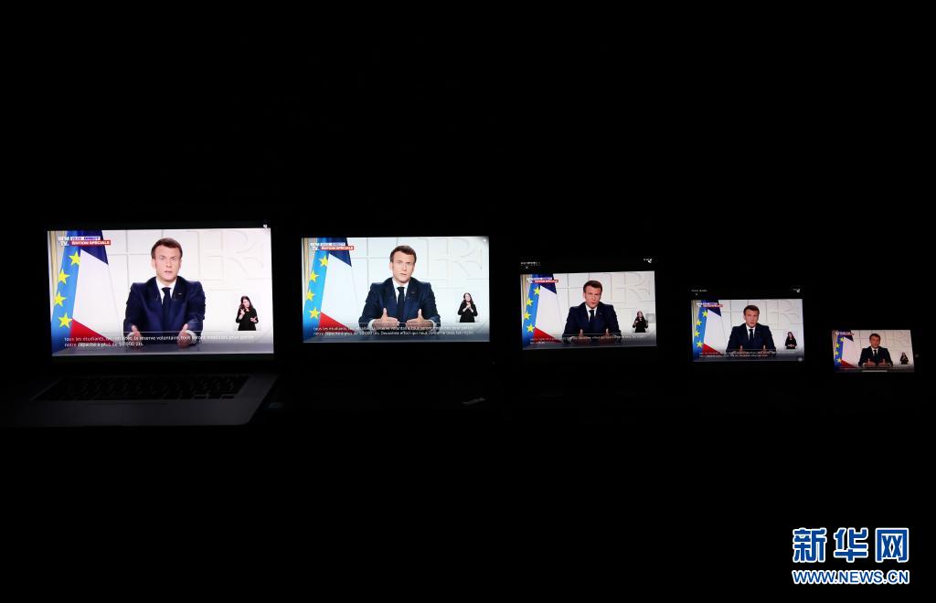 3月31日,在法國巴黎,屏幕上播放著法國總統馬克龍發表全國電視講話時的畫面。 法國總統馬克龍3月31日宣布,法國將在本土所有地區執行封閉隔離措施,以遏制新冠疫情。 新華社記者 高靜 攝