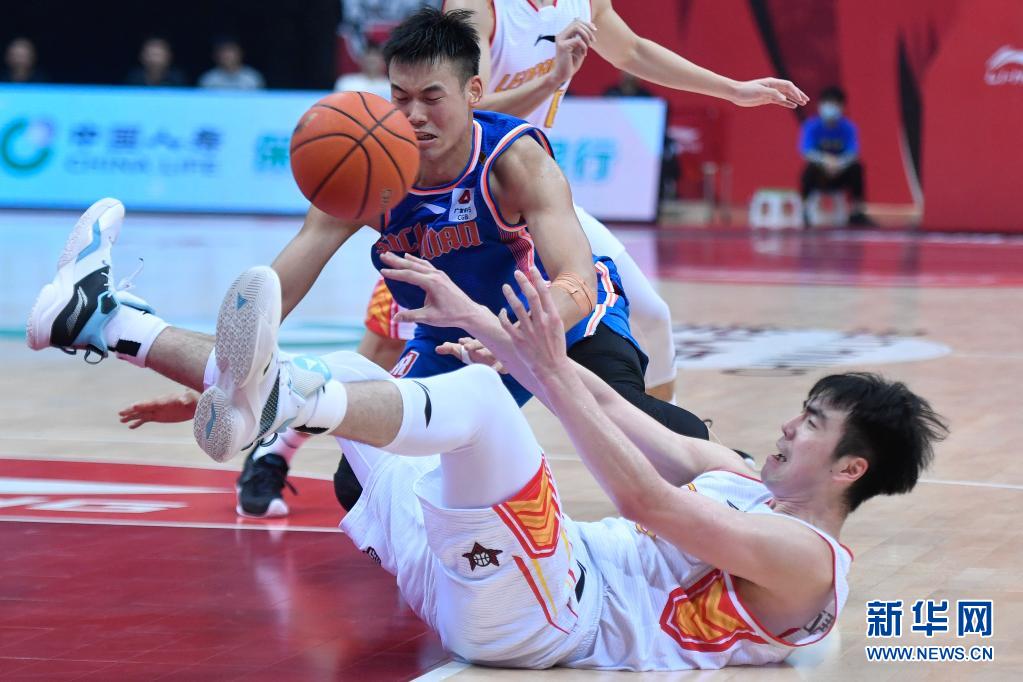 3月31日,深圳馬可波羅隊球員盧藝文(下)在比賽中倒地拼搶。 當日,在浙江諸暨舉行的2020-2021賽季中國男子籃球職業聯賽(CBA)第四階段第51輪比賽中,深圳馬可波羅隊通過加時賽以114比106戰勝四川五糧金樽隊。 新華社記者黃宗治攝