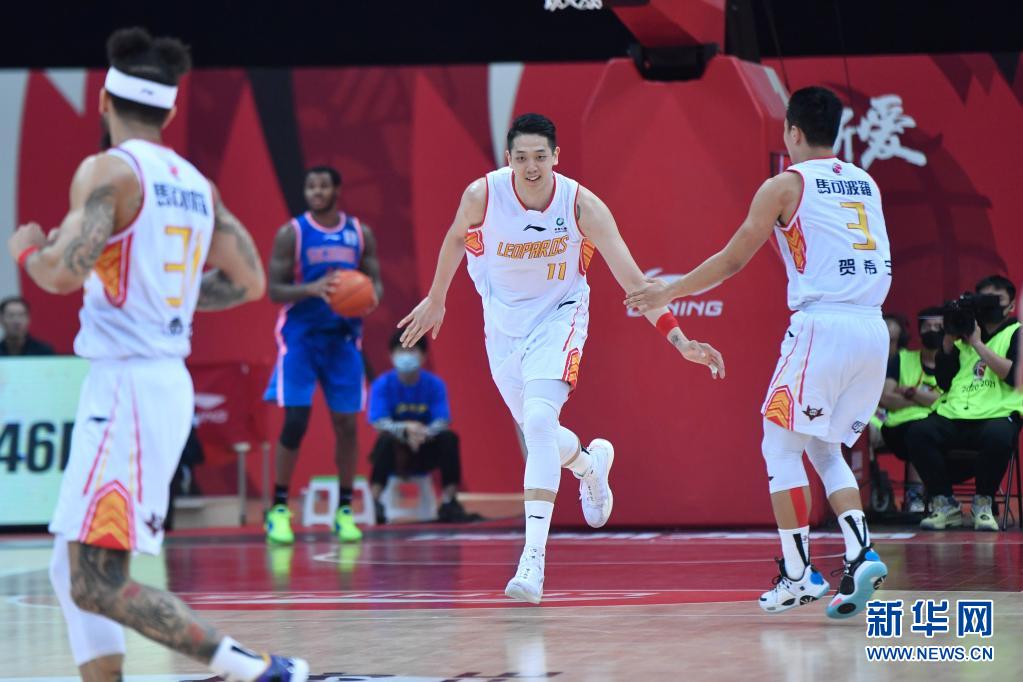 3月31日,深圳馬可波羅隊球員沈梓捷(中)在比賽中慶祝得分。 當日,在浙江諸暨舉行的2020-2021賽季中國男子籃球職業聯賽(CBA)第四階段第51輪比賽中,深圳馬可波羅隊通過加時賽以114比106戰勝四川五糧金樽隊。 新華社記者黃宗治攝