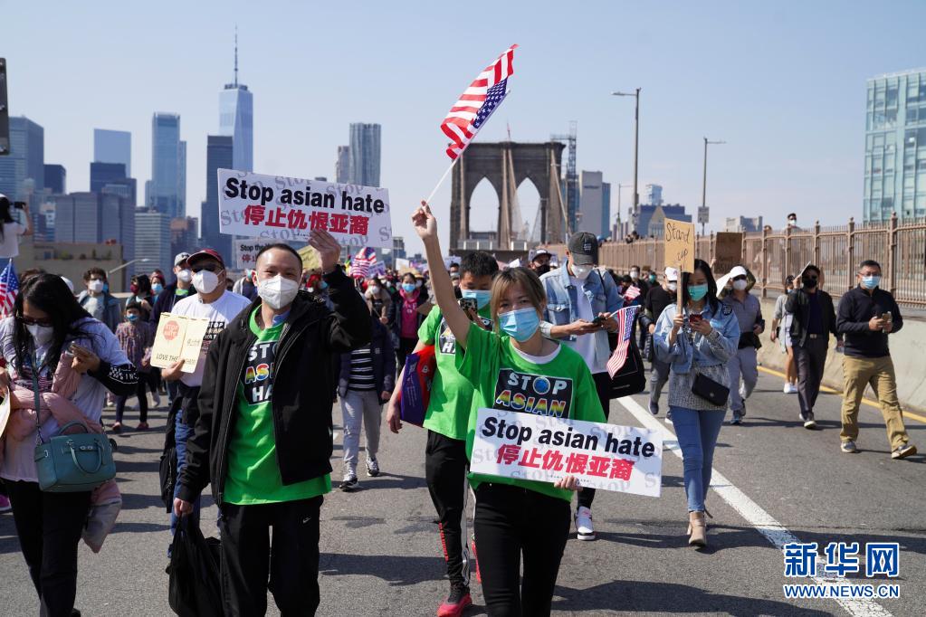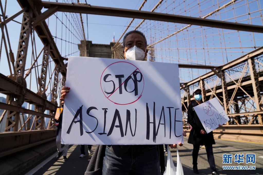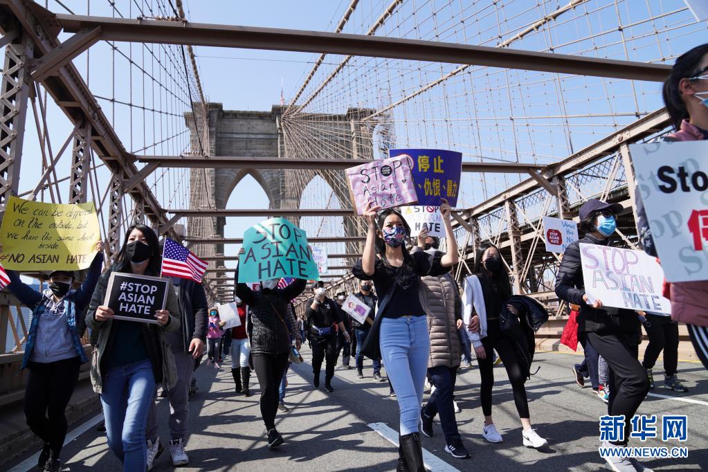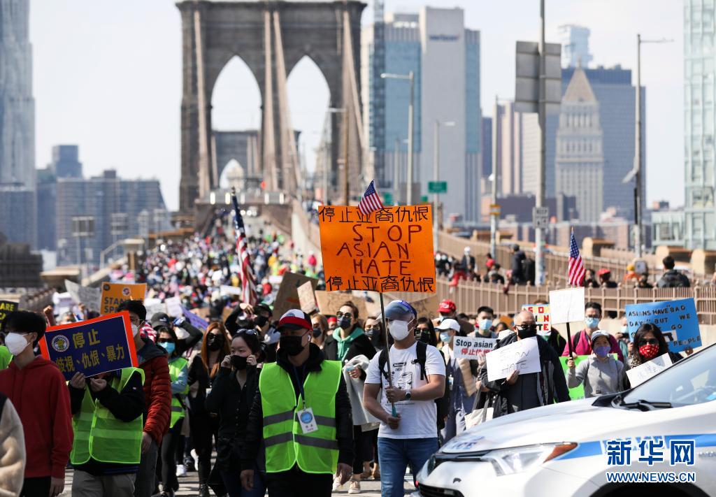 4月4日,在美國紐約布魯克林大橋,人們參加游行反對亞裔仇恨。當(dāng)天,大量示威者在美國紐約舉行主題為“停止仇恨犯罪、反對種族歧視、捍衛(wèi)亞裔權(quán)益”的大型集會(huì)游行活動(dòng)。新華社記者 王迎 攝 |