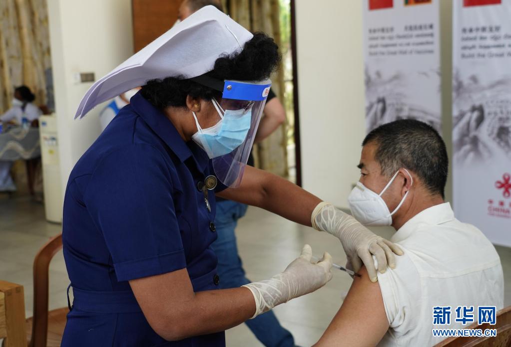 4月5日,在斯里蘭卡科倫坡港口城疫苗接種點,一名中國公民接種疫苗。 中國推出的“春苗行動”5日在斯里蘭卡“一帶一路”建設標志性項目科倫坡港口城營地正式啟動。據中國駐斯大使館介紹,斯里蘭卡政府根據自愿原則將全體在斯中國公民免費納入了當地疫苗接種體系。新華社記者 唐璐 攝 |