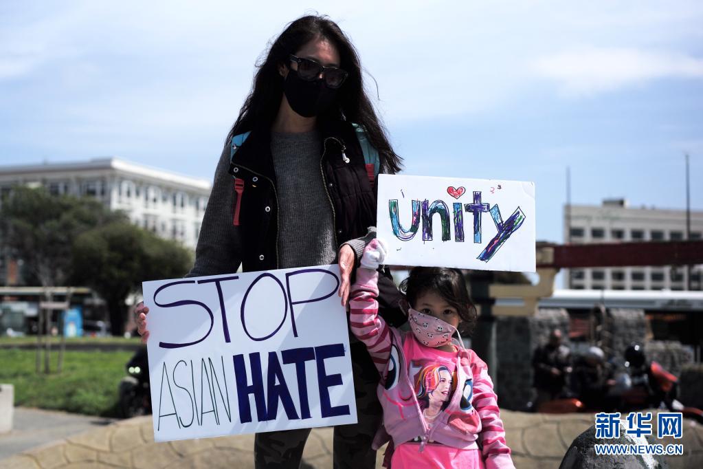 當(dāng)日,美國(guó)加利福尼亞州舊金山灣區(qū)城市奧克蘭民眾舉行集會(huì)抗議針對(duì)亞裔的歧視行為和仇恨犯罪。