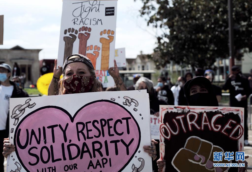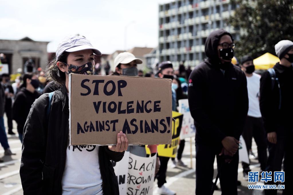 4月3日,在美國加利福尼亞州奧克蘭,人們手舉標語參加集會。 當日,美國加利福尼亞州舊金山灣區城市奧克蘭民眾舉行集會抗議針對亞裔的歧視行為和仇恨犯罪。 新華社記者 吳曉凌 攝
