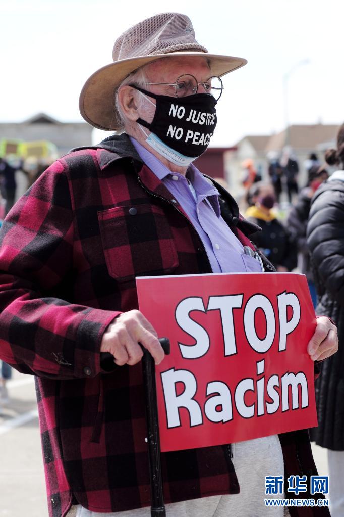 4月3日,在美國加利福尼亞州奧克蘭,一名老人手持標語參加集會。 當日,美國加利福尼亞州舊金山灣區城市奧克蘭民眾舉行集會抗議針對亞裔的歧視行為和仇恨犯罪。 新華社記者 吳曉凌 攝