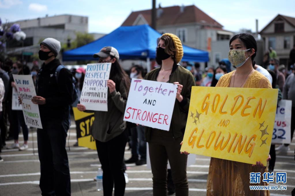 4月3日,在美國加利福尼亞州奧克蘭,人們手持標語參加集會。 當日,美國加利福尼亞州舊金山灣區城市奧克蘭民眾舉行集會抗議針對亞裔的歧視行為和仇恨犯罪。 新華社記者 吳曉凌 攝