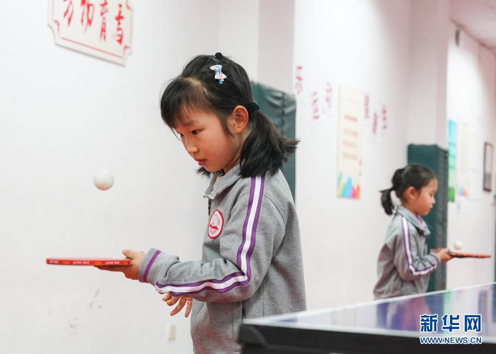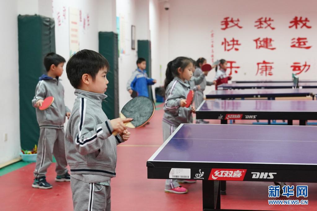 近年來,為發展學生體育特長,豐富校園文體生活,上海市位育實驗學校把開展校園乒乓球活動作為提高學生素質的重要舉措,讓孩子們在鍛煉身體的同時享受乒乓球運動的快樂。 這是學生們在上海市位育實驗學校教室內訓練(3月30日攝)。 新華社記者丁汀攝