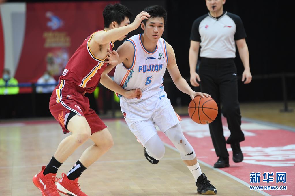 4月5日,福建豹發力隊球員高登(右)運球進攻。 當日,在浙江諸暨舉行的2020-2021賽季中國男子籃球職業聯賽(CBA)第四階段第53輪比賽中,福建豹發力隊以129比111戰勝山西汾酒股份隊。 新華社記者 翁忻旸 攝