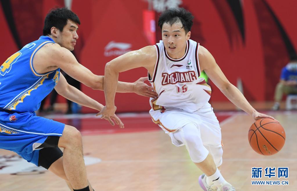 4月8日,浙江稠州金租隊(duì)球員王奕博(右)運(yùn)球突破。