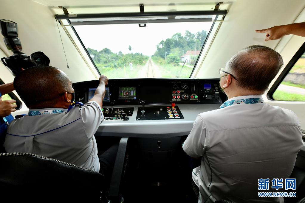 4月11日,在馬來西亞吉蘭丹州首府哥打巴魯,馬交通部長魏家祥(右)乘坐動車。