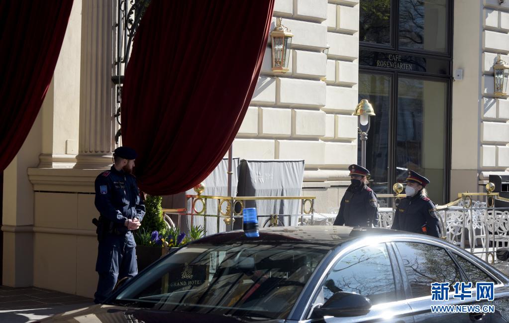 4月9日,警察在奧地利維也納伊朗核問題全面協議會場外執勤。伊朗核問題全面協議相關方會議4月9日繼續在奧地利首都維也納舉行。新華社記者 郭晨 攝