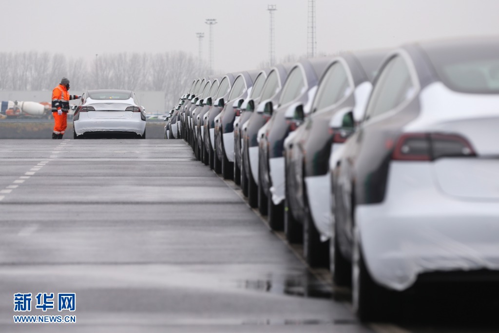 2020年11月27日,工作人員在比利時澤布呂赫港對中國制造的特斯拉Model 3汽車進行裝卸作業。(新華社記者鄭煥松攝)
