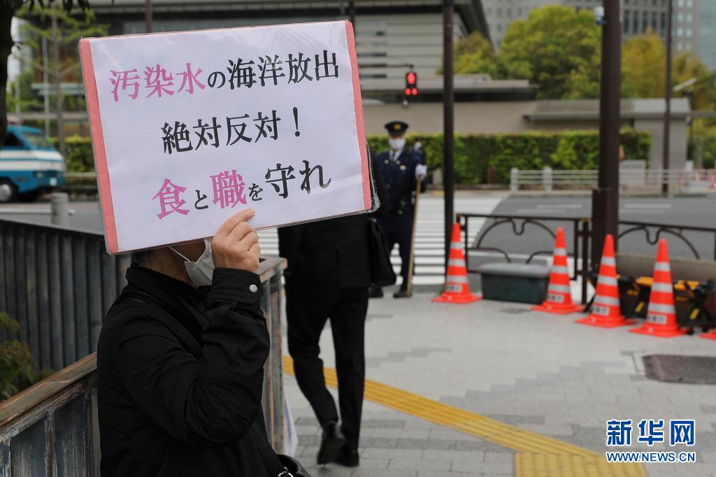 4月13日,抗議者在日本東京的首相官邸外反對福島核污水排入大海。新華社記者 杜瀟逸 攝