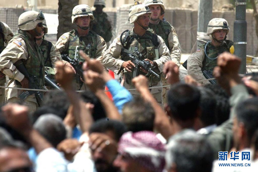 這是2003年6月18日,美軍士兵在伊拉克首都巴格達美英聯軍臨時總部門前持槍面對數百名示威的伊拉克人。