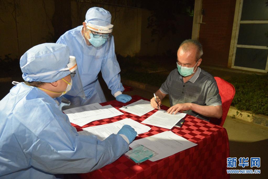 4月17日,在蘇丹喀土穆中油國際尼羅河公司的新冠疫苗接種點,中國第36批援蘇丹醫療隊醫生為在蘇中國公民接種中國國產新冠疫苗進行登記。